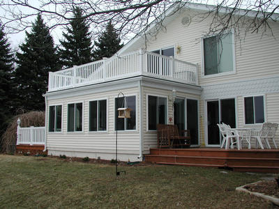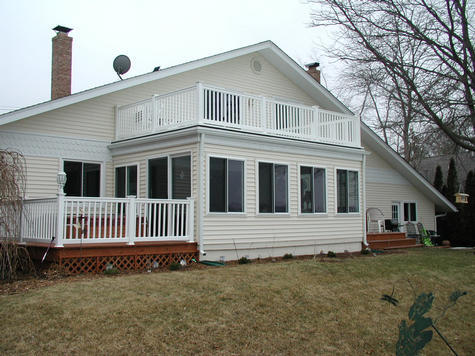 Two standard decks with a viewing deck above a sunroom, all overlooking the lake. The homeowners love their new outdoor living space.