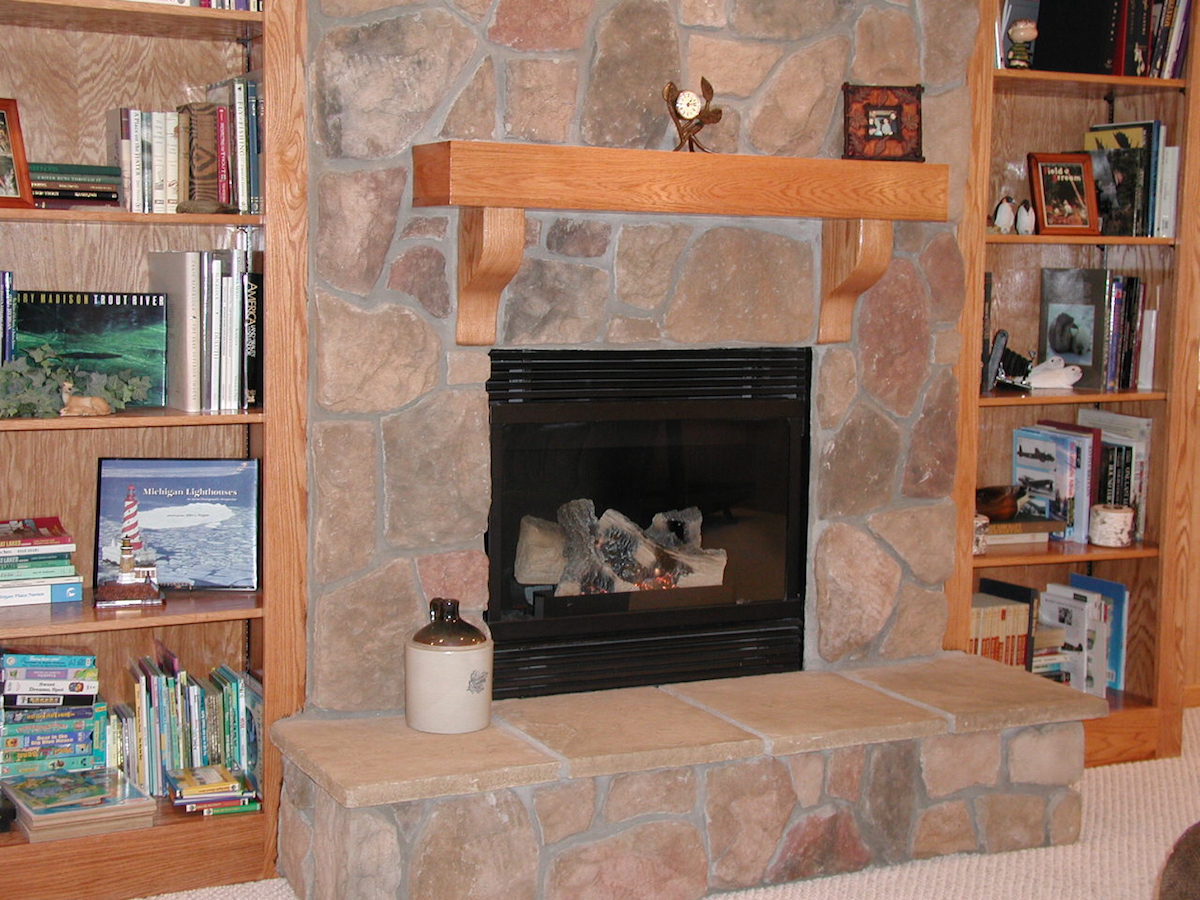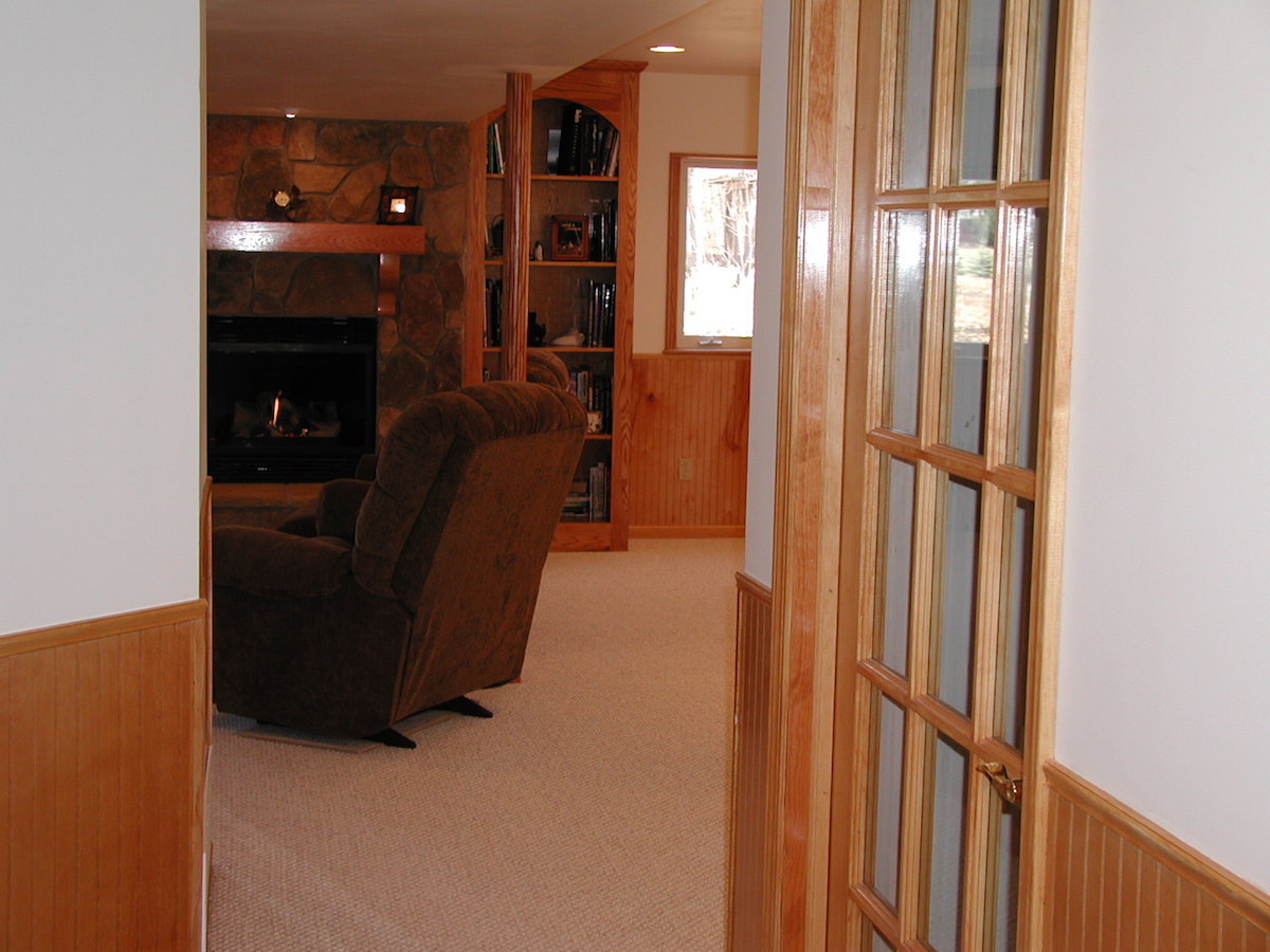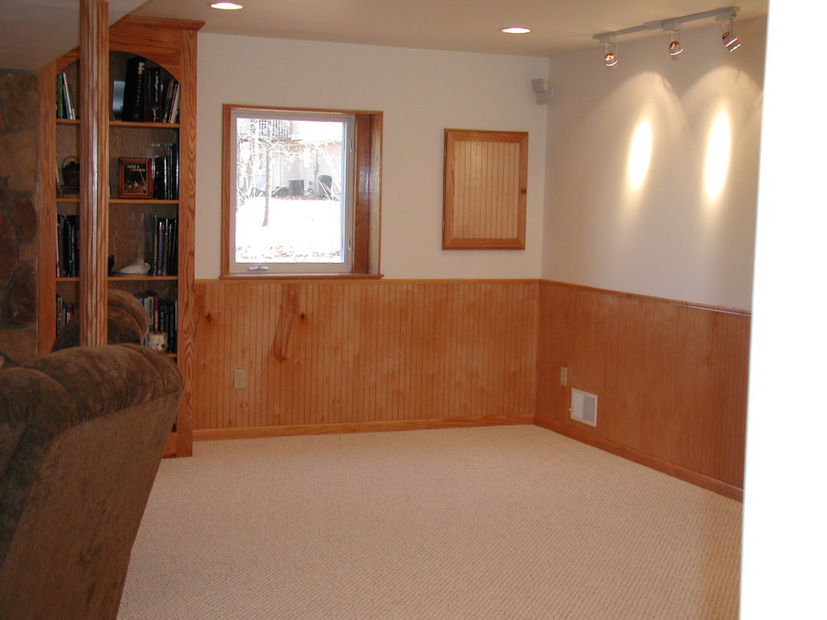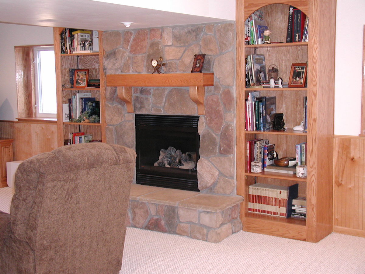 We finished this basement with a custom fireplace & bookcase surrounds. This finished basement has a large oak mantel & cultured stone surround. The owners are very fond of oak so we used oak wainscoting around the finished basement also. We wrapped the support poles with oak covers & made a custom utility panel cover, too.