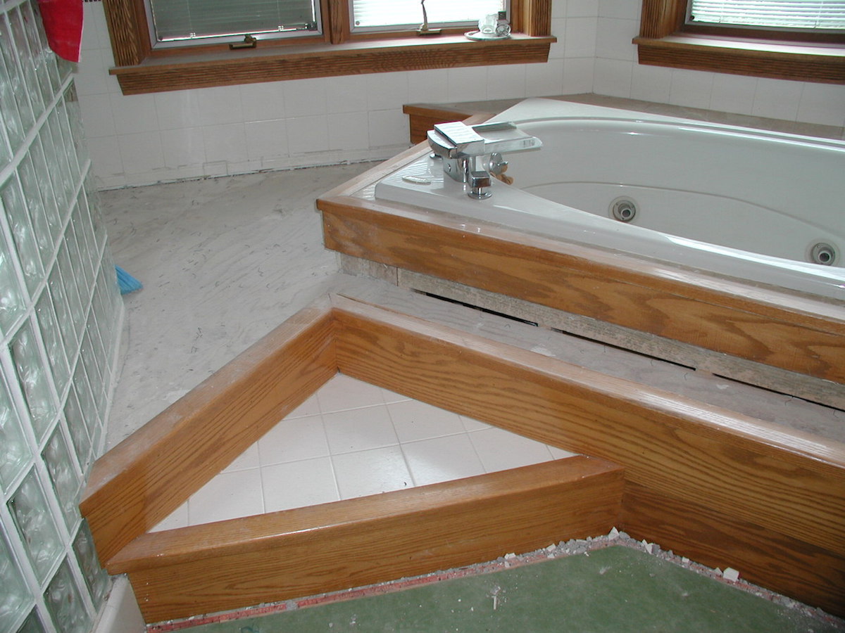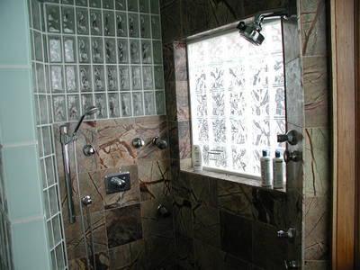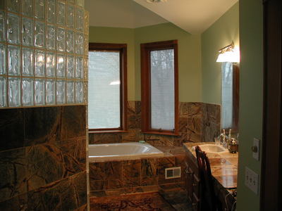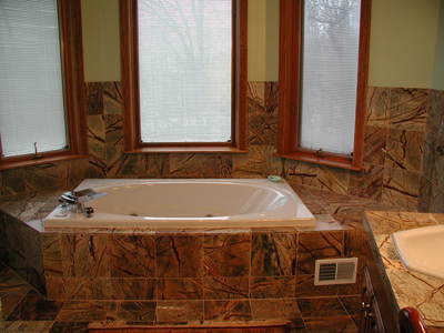 Complete remodel of master bath. We remodeled this bathroom with unique marble tile that sets this bathroom apart from the rest. A custom shower with several showerheads & body sprays for a spa like experience.