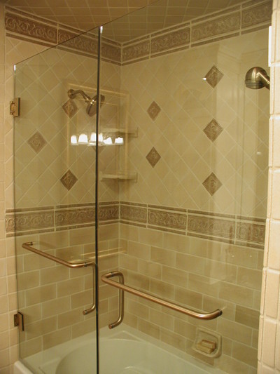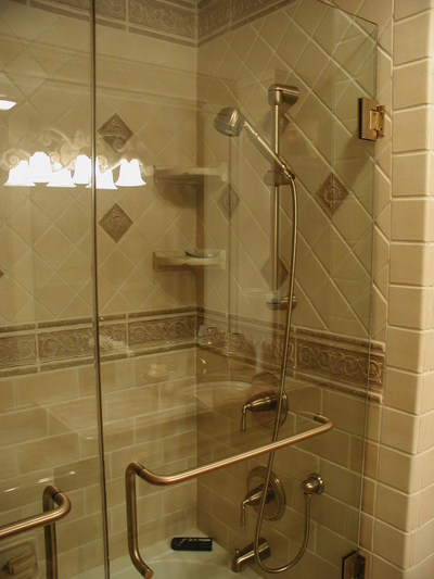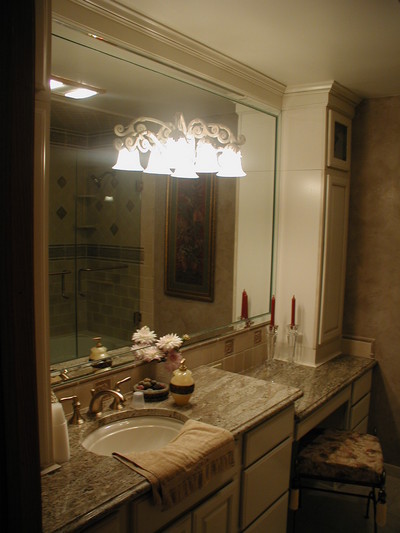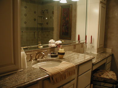 Not a large bath; but, what an improvement! Unfortunately, before photos are not available but the alterations we made really changed this master bath. We maximized the space by extending the vanity across one wall, adding a makeup area and wall cabinets. We reconfigured the custom tiled shower and added an extra showerhead.