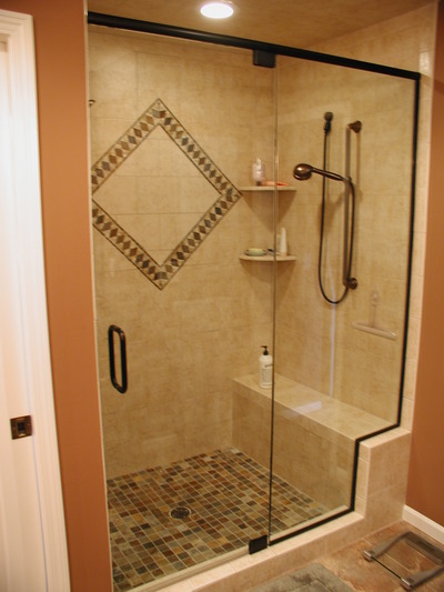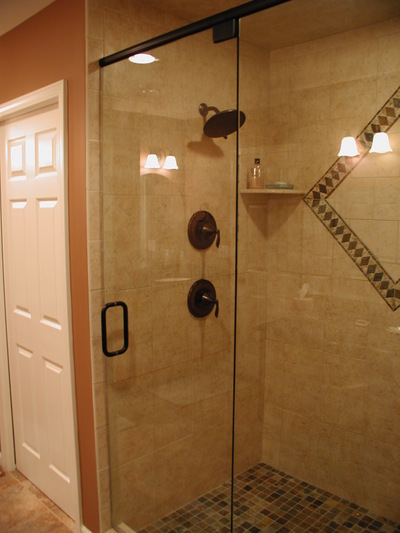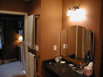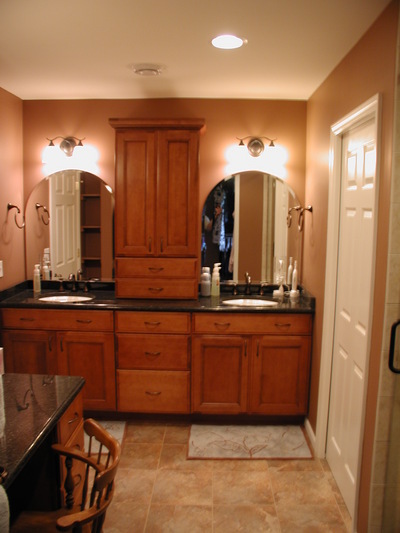 Remodel of existing master bath, and bedroom off the hall, to create much needed new bath and closets for master suite. This large double sink vanity creates separate areas for him & her. There also is a makeup vanity with a trifold mirror. The custom shower has a bench for relaxation, two shower heads & unique tile accent on the back wall.