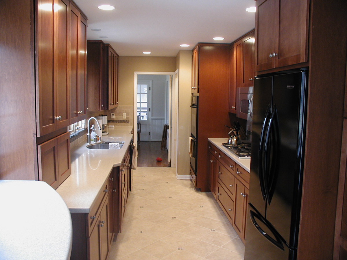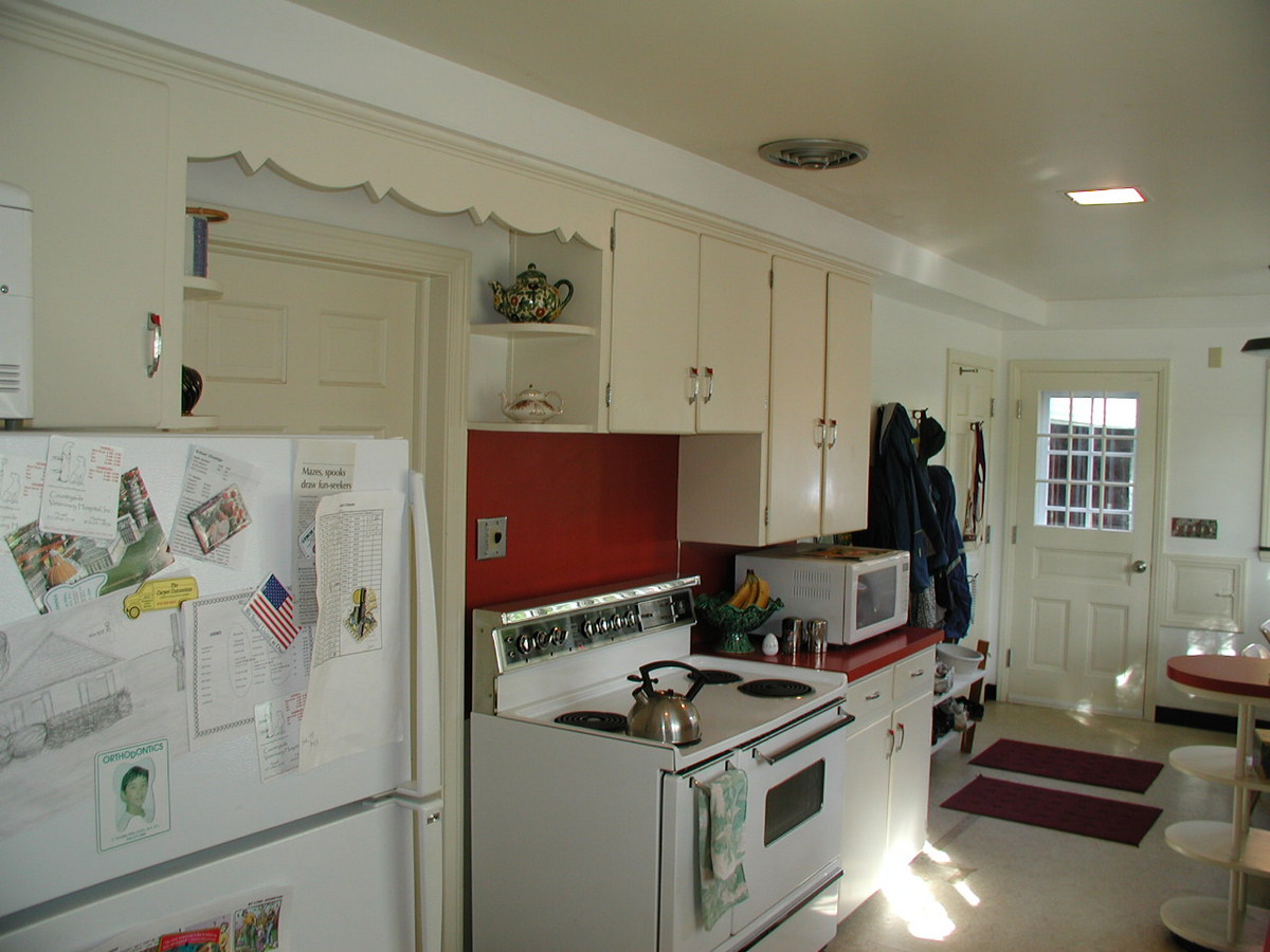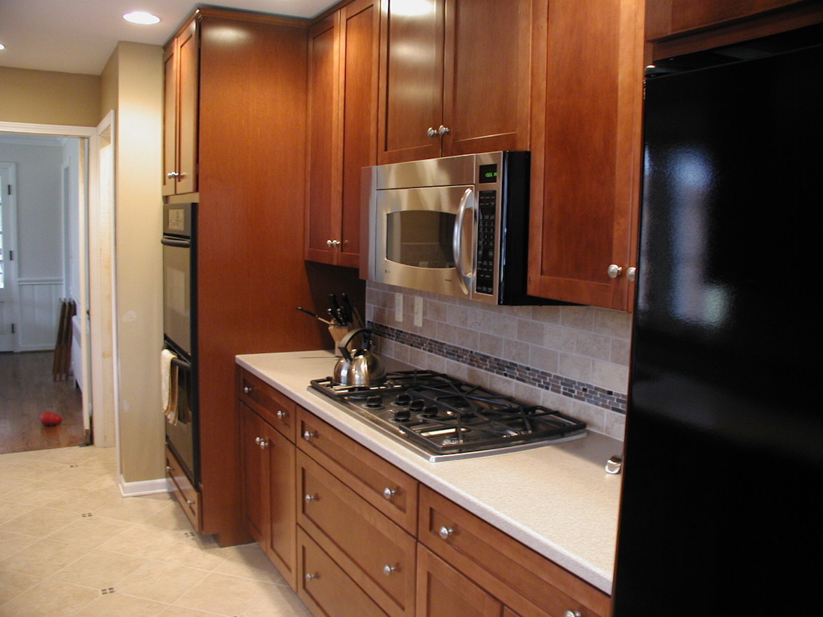 This 1950’s kitchen was in desperate need of a remodel. We maximized the usable square footage by closing off a door to an adjoining room. This allowed for a larger galley style kitchen. By removing the soffits we were able to take the new cabinets up the ceilings, increasing the storage area. We used shaker style cabinets in a medium wood finish with a tumbled marble & glass tile backsplash. We eliminated the small dining are & added a breakfast bar using the solid surface Corian countertop. This kitchen remodel was a drastic change.