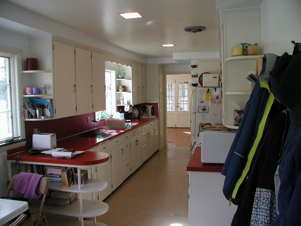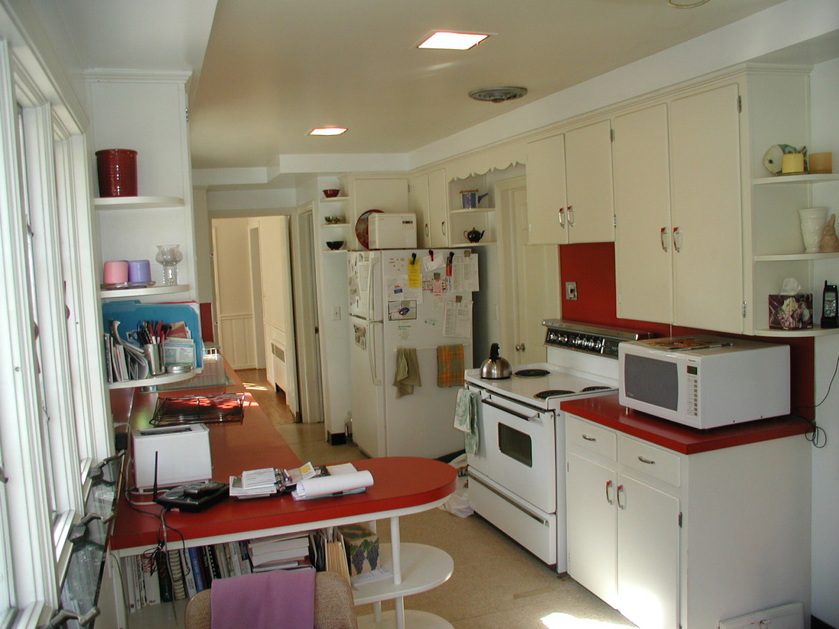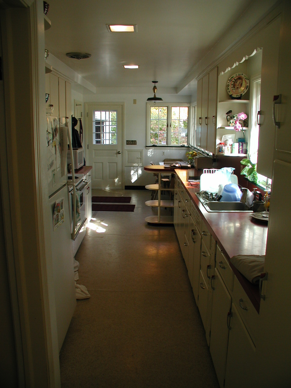 This 1950’s kitchen was in desperate need of a remodel. We maximized the usable square footage by closing off a door to an adjoining room. This allowed for a larger galley style kitchen. By removing the soffits we were able to take the new cabinets up the ceilings, increasing the storage area. We used shaker style cabinets in a medium wood finish with a tumbled marble & glass tile backsplash. We eliminated the small dining are & added a breakfast bar using the solid surface Corian countertop. This kitchen remodel was a drastic change.