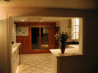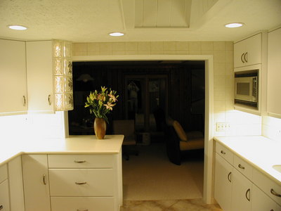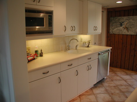 Contemporary kitchen remodel. This space is light & bright. We added several lighting features such as recessed lighting, under cabinet light, toe kick lighting & back lit glass block. We used white slab cabinets with a light Corian countertop & white tile backsplash. The homeowners love their new kitchen.