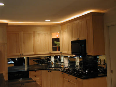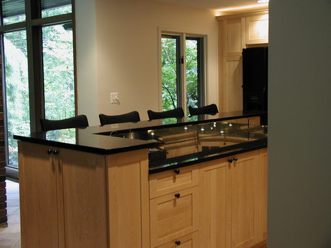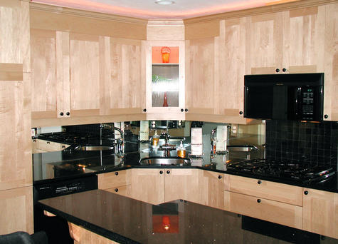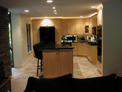 Kitchen remodel – a little on the contemporary side. We used natural shaker style cabinets, light tile flooring and beautiful dark granite countertops for a nice contrast. We added additional lighting to keep the space light & bright. We also used a mirrored backsplash to reflect light back into the new kitchen. What a transformation!