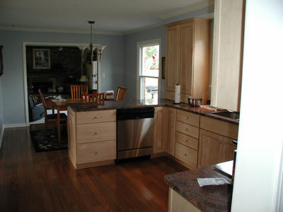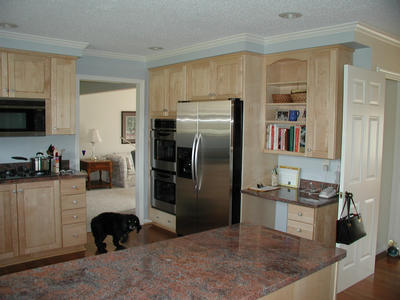 Full kitchen remodel. We used natural stained cabinets to lighten up the space & darker wood floors & granite countertops for a nice contrast. Crown molding on the cabinets & walls finishes off this space nicely.