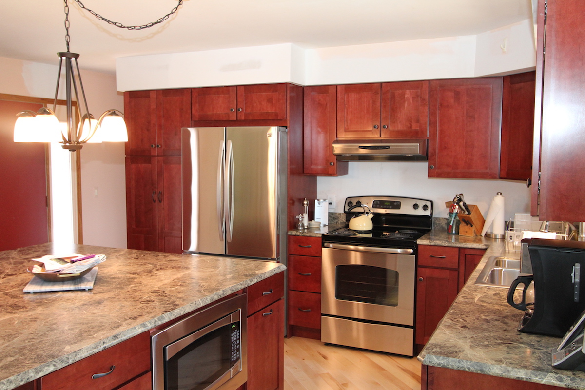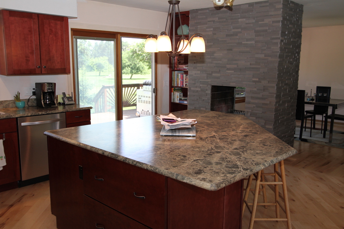This 1970’s kitchen was in need of a complete remodel. We gutted the kitchen & added diagonal hardwood floors in the kitchen & dining room. We expanded the kitchen area slightly to increase storage area & countertop space. By enlarging the island we were able to double the storage space, add a breakfast bar & put the microwave in a base cabinet. Believe it or not, these countertops are laminate. By using Formica’s 180FX high definition laminate tops we saved the client some cost but still achieved the marble look & feel. The shaker style cherry cabinets contrast well with the greenish marble look tops. The owners were going to paint the walls at a later date. All in all, this kitchen remodel is a wonderful transformation.