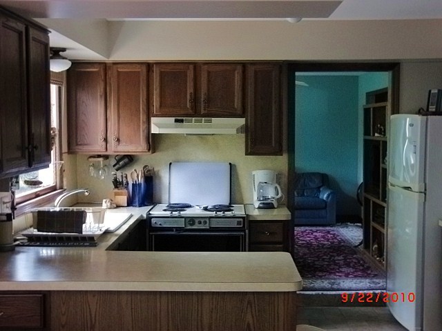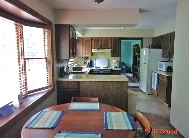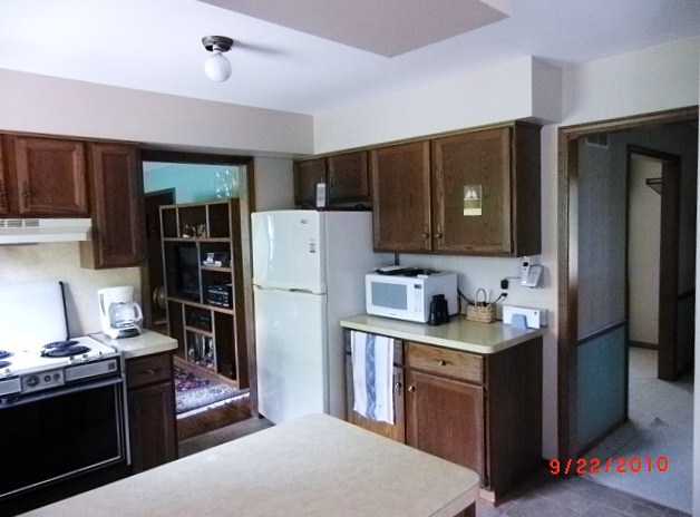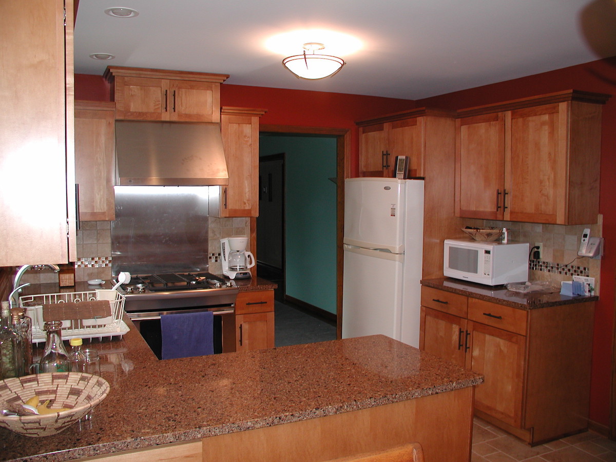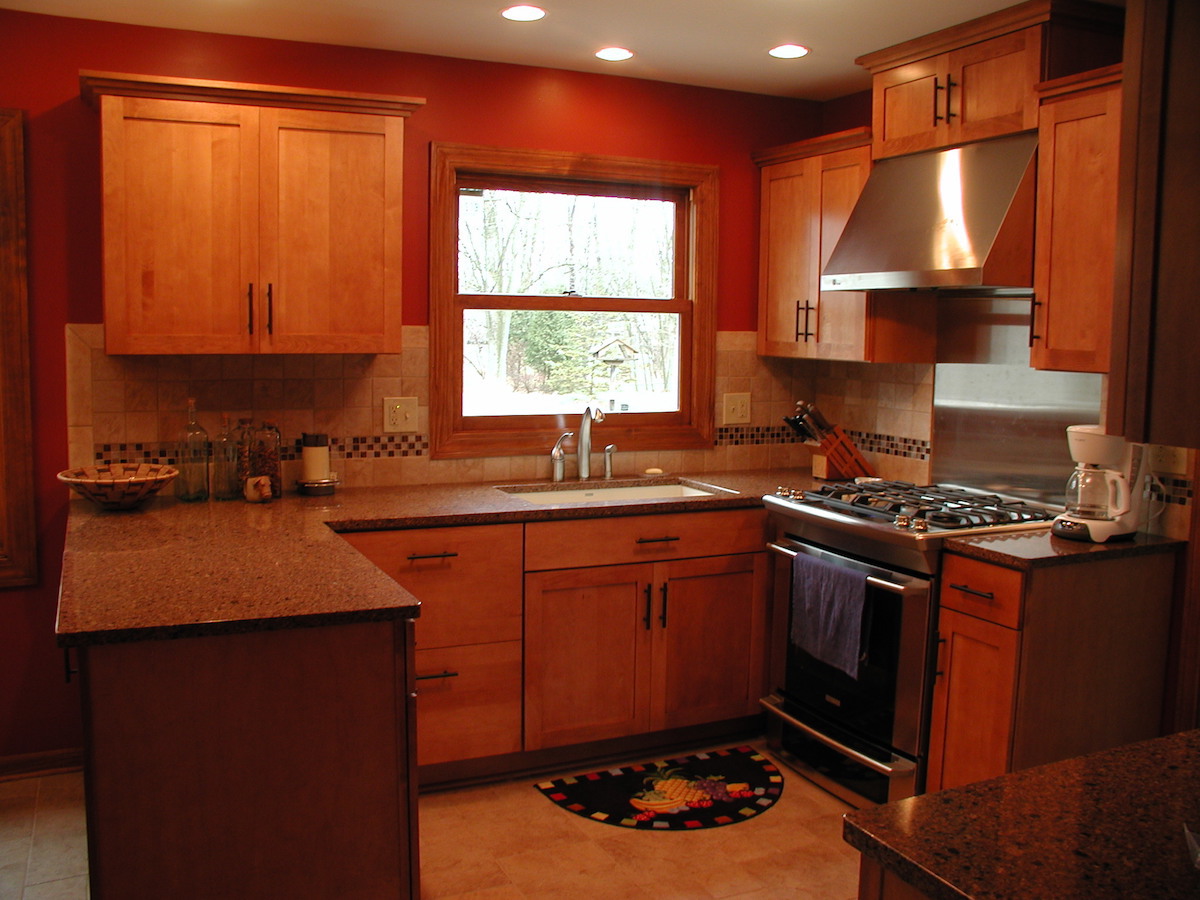 With this kitchen remodel we didn’t change the floor plan but it was completely updated with Decora shaker style cabinets, Cambria quartz countertops & we removed the soffits to open up the kitchen. The homeowners wanted a low maintenance backsplash so we installed a stainless steel sheet behind the stove for easy cleaning. The rest of the backsplash is tumbled marble with glass accent tile. They went with a bold color on the walls to really spice up this kitchen remodel.