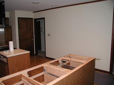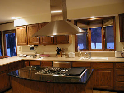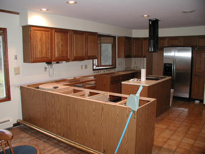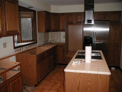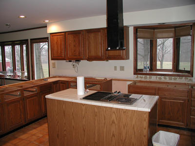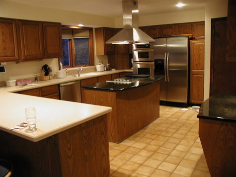 Basic remodel leaving the room and existing cabinetry and flooring in place. We added Corian and granite countertops with stainless steel appliances, a desk area, and modified lighting. A minimum of disruption and yet a whole new kitchen.
