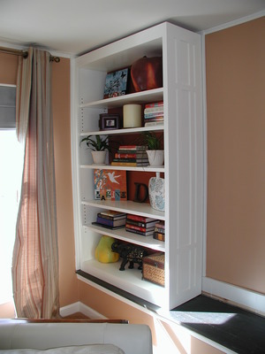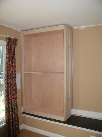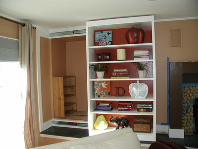 This home was built with a "cubby" that the new owners didn't really care for. We came up with the idea of bookshelves and that led to keeping the "cubby" for storage but hidden by a movable shelving unit. Our client chose to do the finishing of the paint and it turned out really nice.