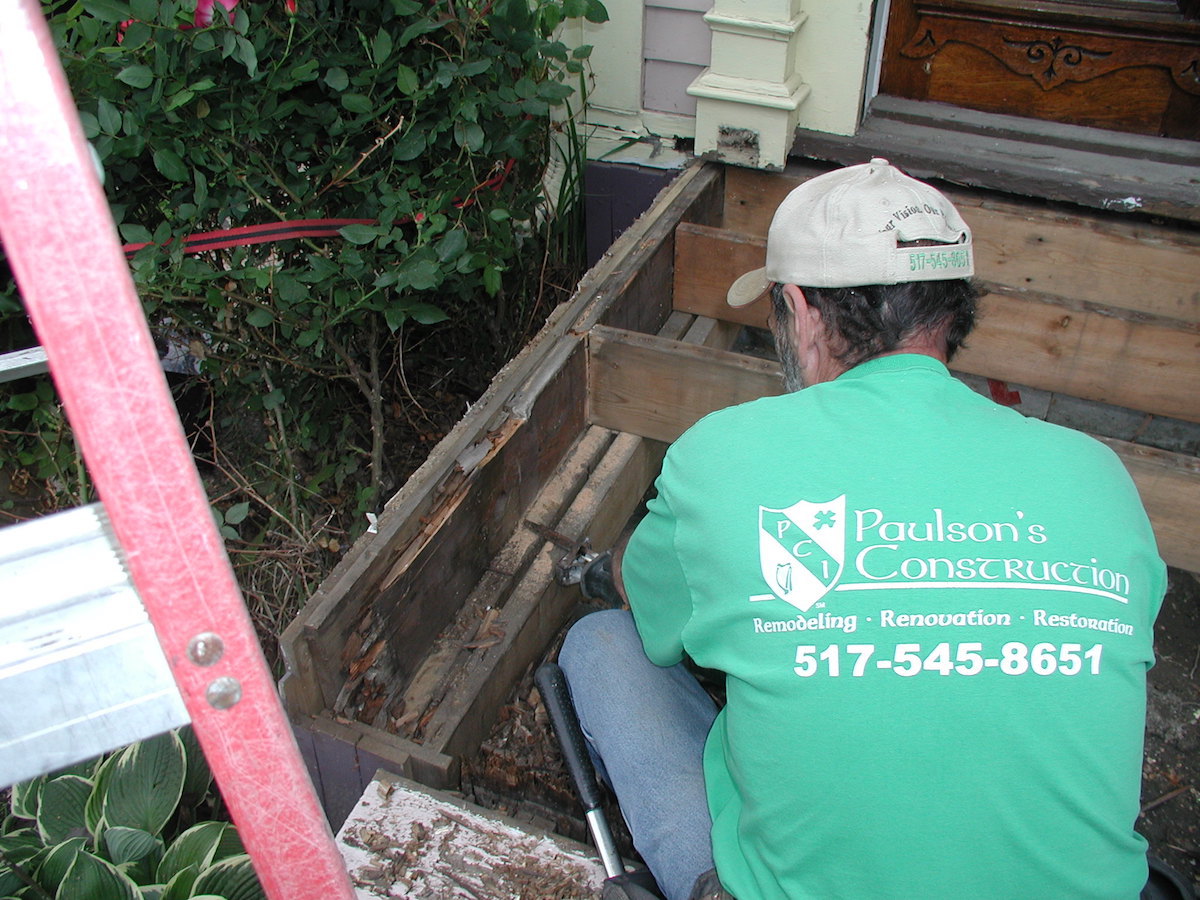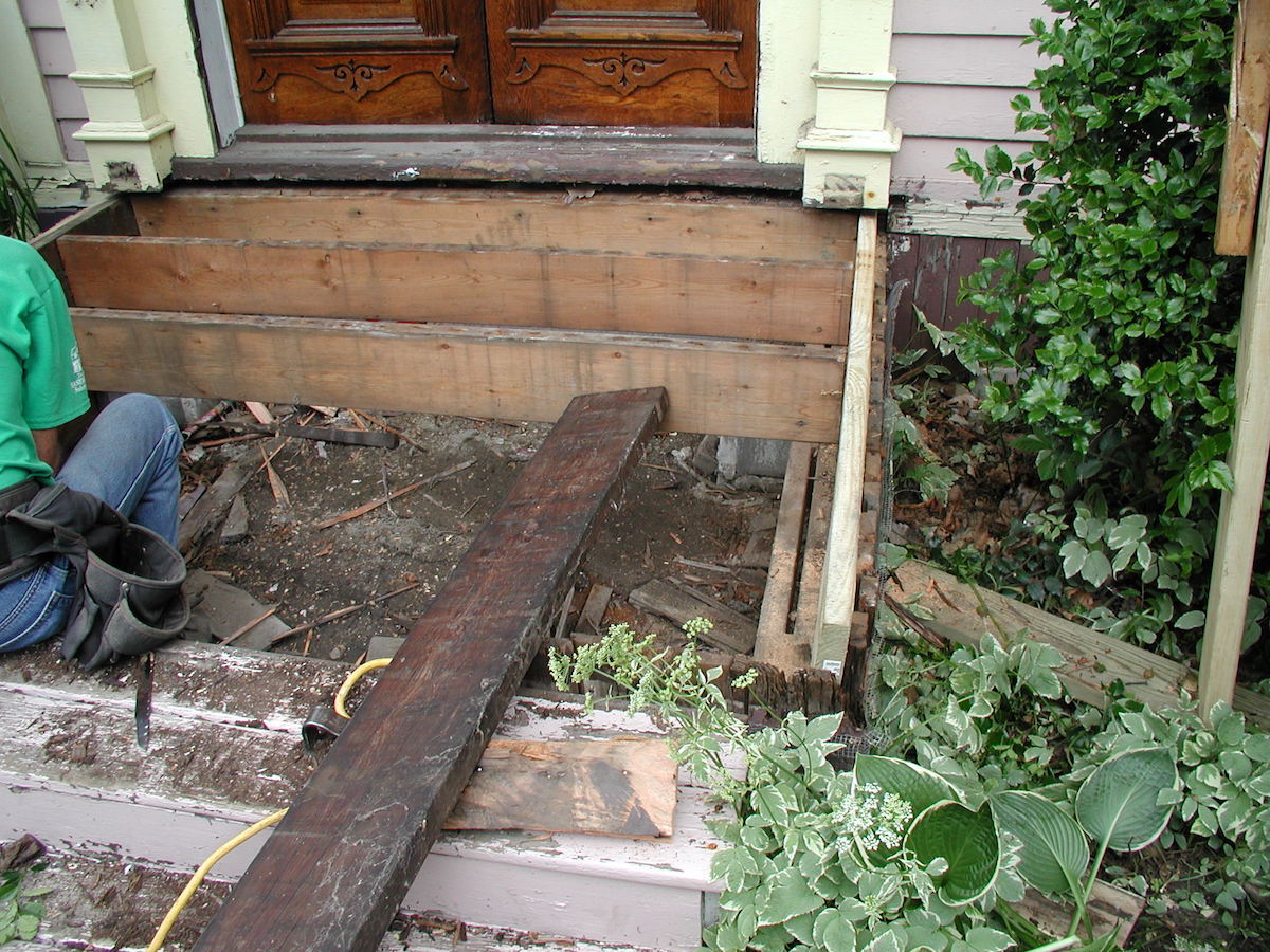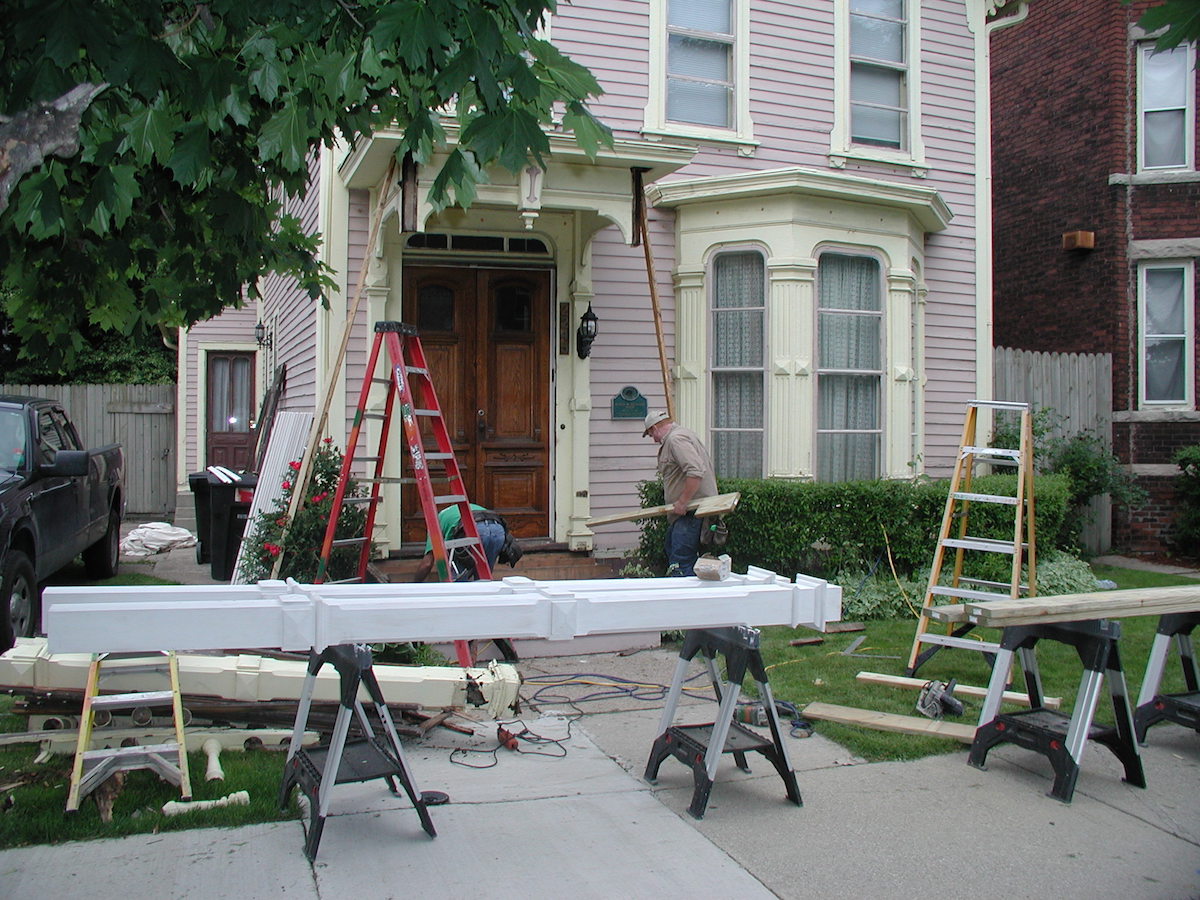 This front porch on a historic home in the shadow of the old train station in Detroit’s Corktown was in bad shape. It was completely rotted & in desperate need of repair. The substructure, floor boards, columns & railing all needed to be replaced. We specialize in historic restoration & love doing this kind of work. The owner was very pleased with the results & we were glad to be able to help!